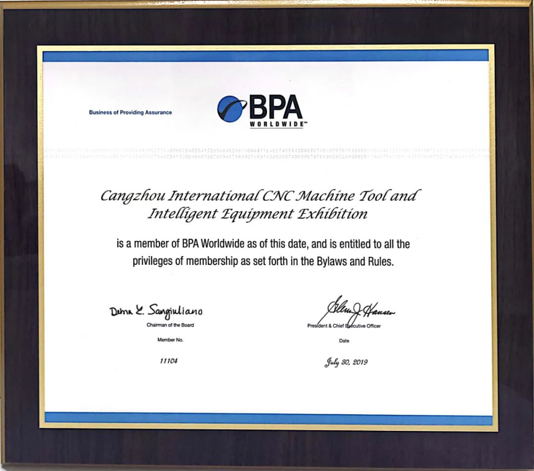 丞華滄州國際數(shù)控機床及智能裝備展覽會(簡稱:滄州機床展)已成功通過國際著名展會認證機構(gòu)BPA Worldwide認證,這標志著丞華滄州機床展的辦展品質(zhì)和專業(yè)程度得到國際權(quán)威認證機構(gòu)的認可,也是對主辦方展覽面積、展商數(shù)量、觀眾數(shù)量等一系列展會數(shù)據(jù)真實有效性的肯定。