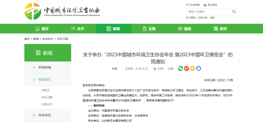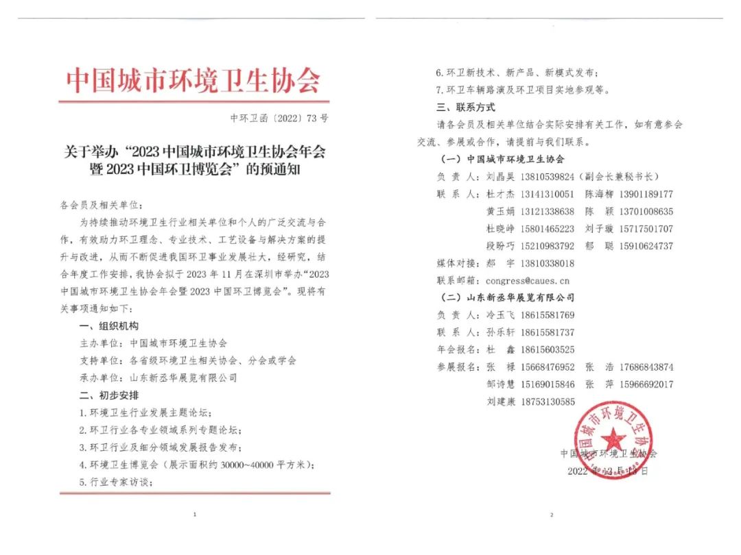 此次預通知的下發(fā),標志著2023中環(huán)協(xié)年會展會正嶄新啟航,各項籌備工作已拉開帷幕。在往屆展會成功舉辦基礎上,2023年活動具體規(guī)劃還將進一步細化,有關內容安排將不斷完善,屆時為環(huán)衛(wèi)行業(yè)及相關人士帶來一場全國性重量級品質盛會!