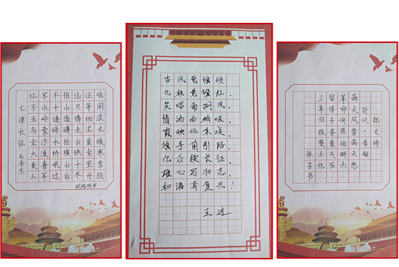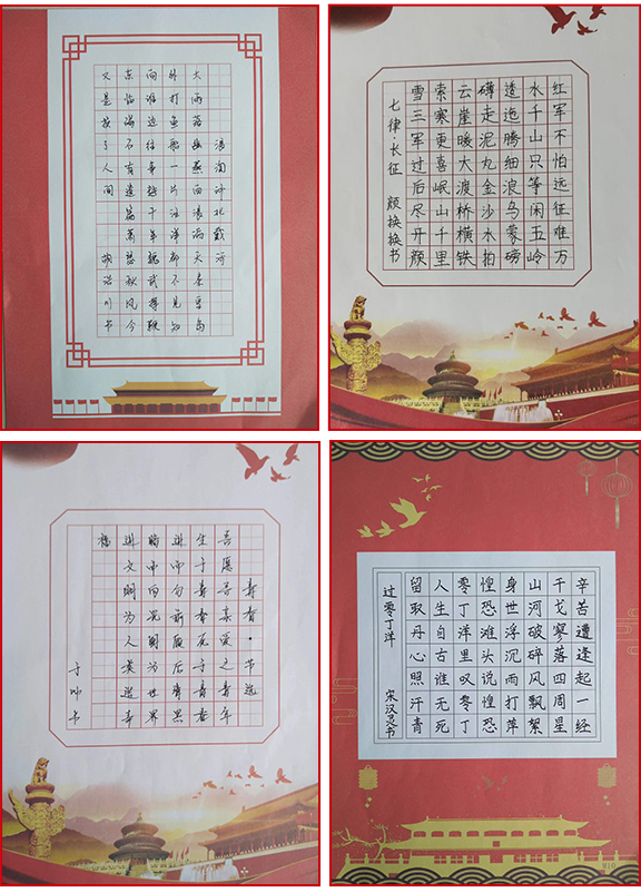 以史為鑒,可知興替;以詩為馬,莫負(fù)韶華。本次參加活動(dòng)的黨員們用堅(jiān)定的筆觸,澎湃的心情重溫革命語錄、抄寫紅色詩詞,字里行間深切地感受黨的光輝發(fā)展歷程。書寫的作品結(jié)構(gòu)均勻,筆畫流暢,橫平豎直整齊美觀,落筆之處或輕或重,或緩或急,橫、豎、撇、捺、點(diǎn)間,可以看出大家的認(rèn)真態(tài)度。“紅軍不怕遠(yuǎn)征難,萬水千山只等閑”、“雄心寫壯志,和諧奔復(fù)興”、“漫天風(fēng)雪滿天愁,革命何須怕斷頭”、“雄關(guān)漫道真如鐵,而今邁步從頭越”……從一篇篇的抄錄作品中,我們仿佛又看到了中國共產(chǎn)黨那段艱苦卓絕的奮斗歷程,體會(huì)了革命先烈不屈不撓、英勇頑強(qiáng)的大無畏氣概。