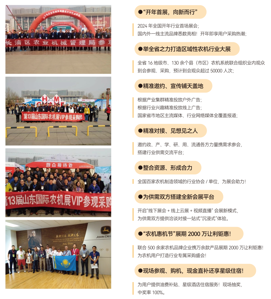 本屆山東農(nóng)機展以“新格局、新理念、新發(fā)展”為主題,展會還將同期舉辦“農(nóng)機設(shè)備-山東惠機節(jié)”活動。“惠機節(jié)”是展會打造的專屬于農(nóng)機用戶行業(yè)的采購節(jié)日,組委會將聯(lián)合500余家農(nóng)機品牌企業(yè)攜萬余款產(chǎn)品展期讓利鉅惠!