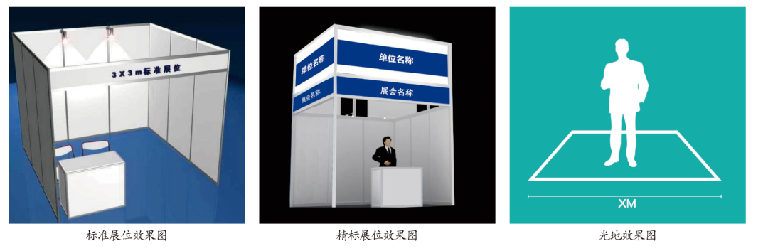 2. 精標(biāo)展位基本配置:3m×3m展位(包括精裝標(biāo)準(zhǔn)展臺(tái)、布幅廣告門楣、地毯、一桌兩椅、門楣射燈、展位射燈、220V電源插座);